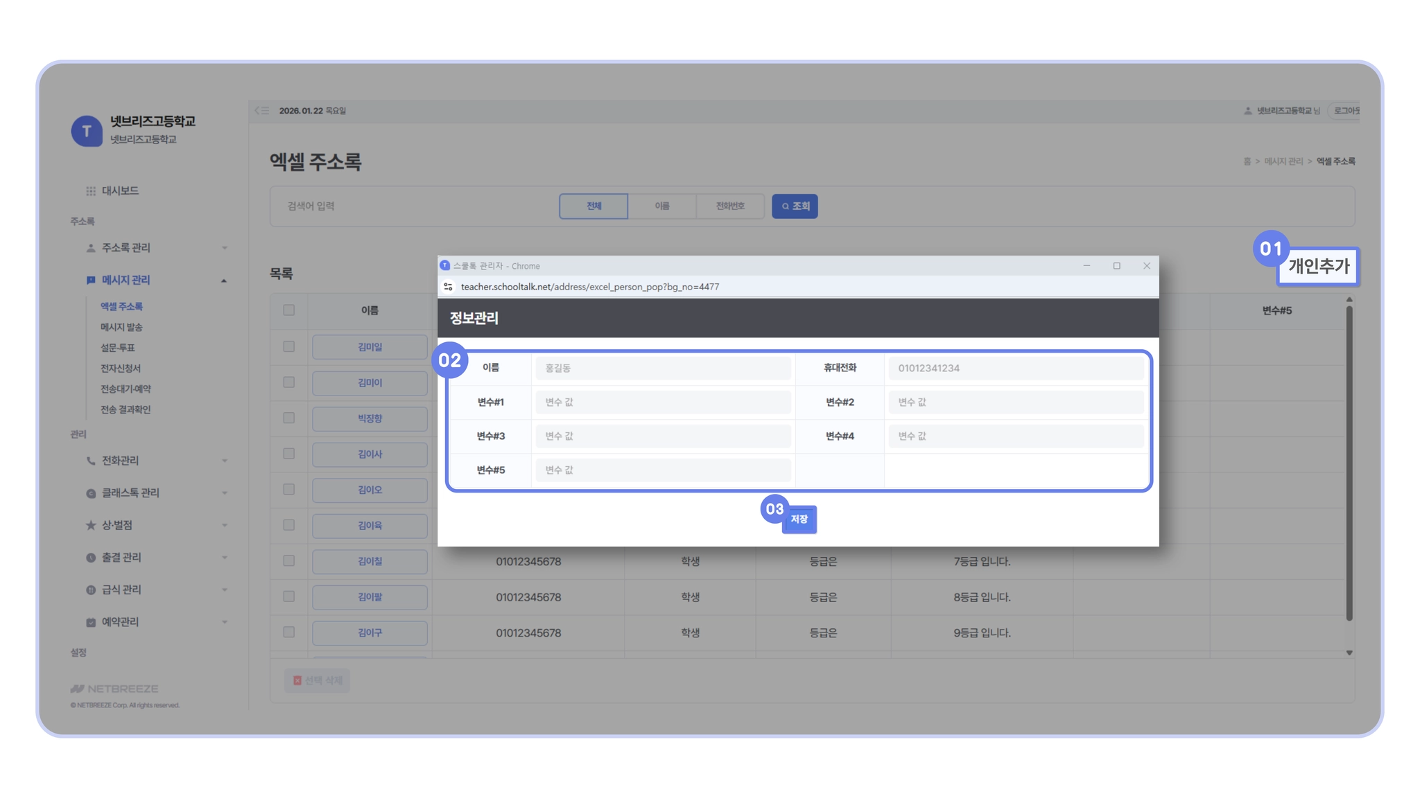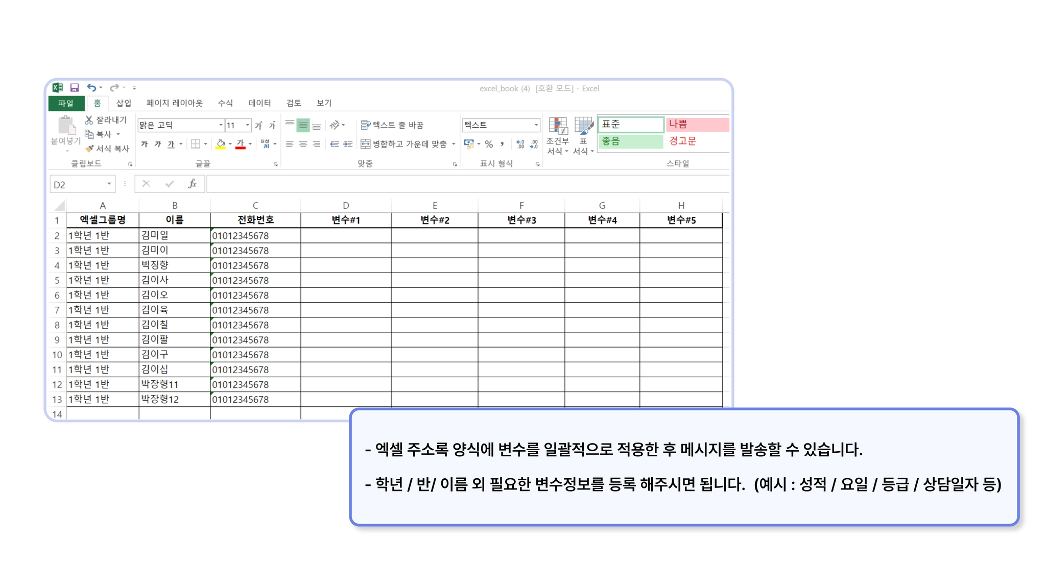 주소록 관리에 등록되지 않은 개별의 대용량 주소록 & 변수 정보(예: 점수, 개별 메시지 등)를 일괄적으로 등록하여 메시지를 발송할 수 있습니다.