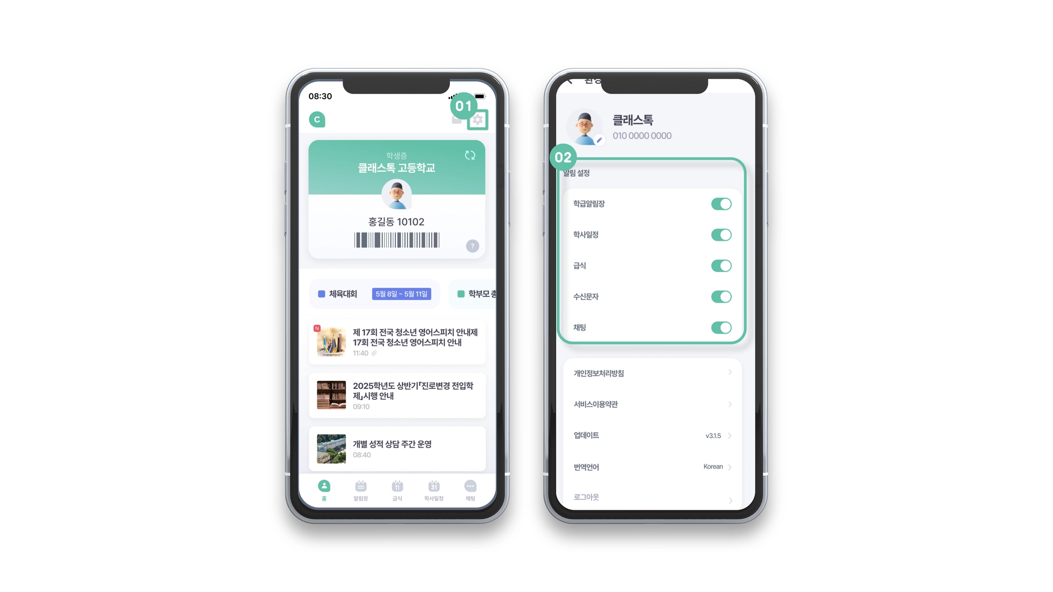 학생, 학부모님! 을 서비스별 App 알림과 번역 언어를 설정해 보세요.