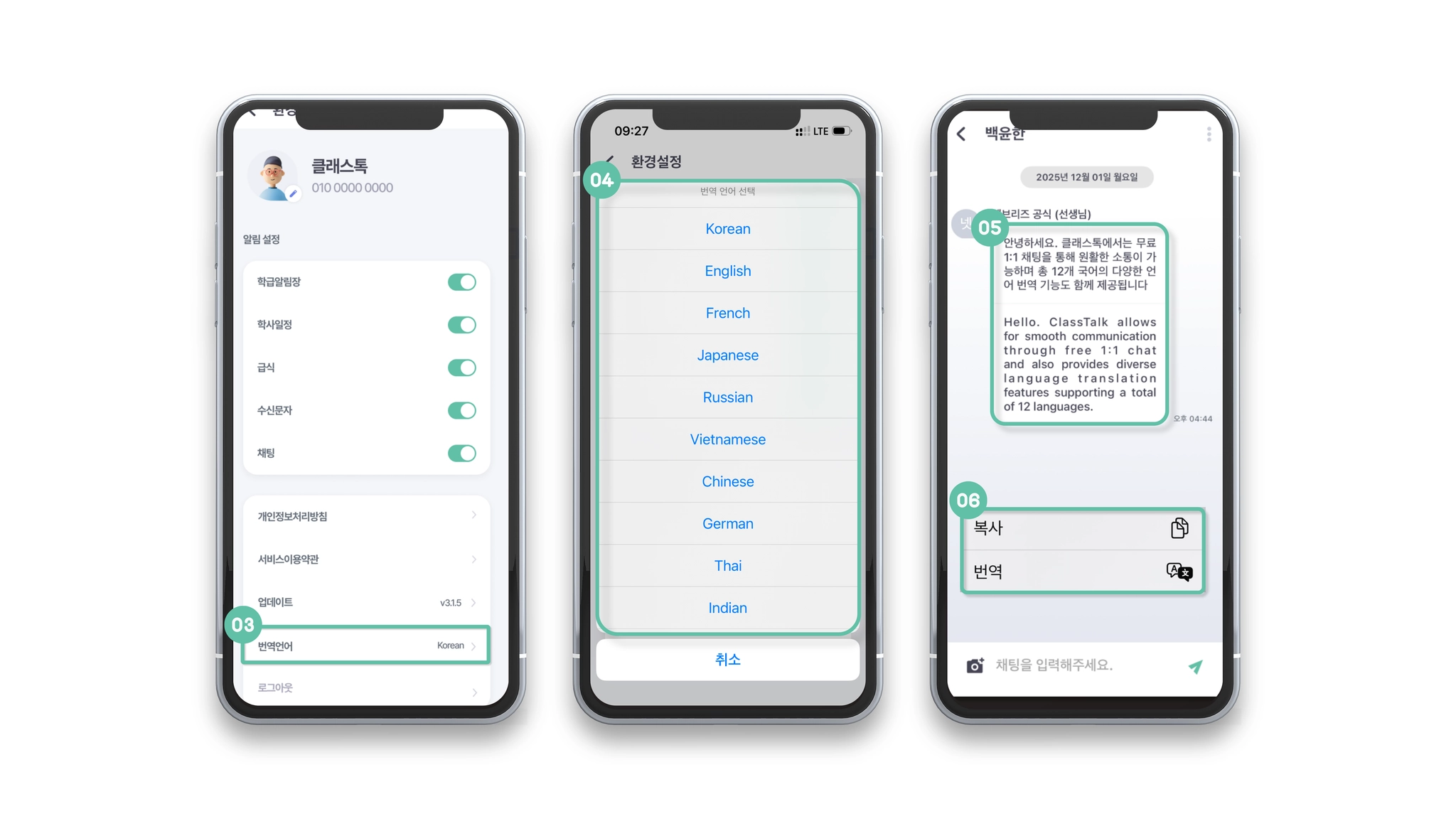 하세요. ☞ 클래스톡(APP) 내의 1:1 채팅 언어 번역 설정 기능이 있습니다. (12개 국어)