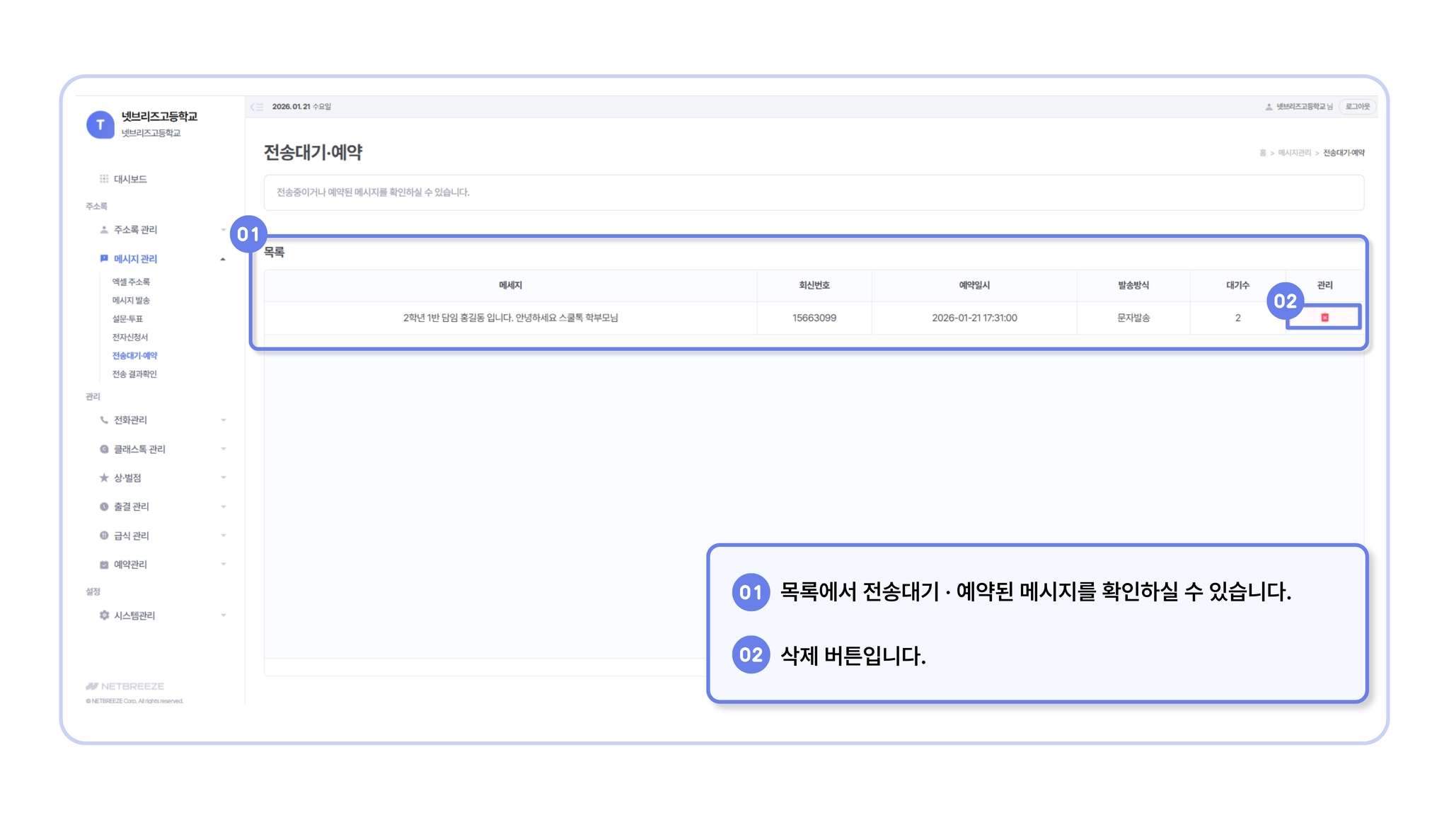 메시지 관리 > 전송대기 · 예약]