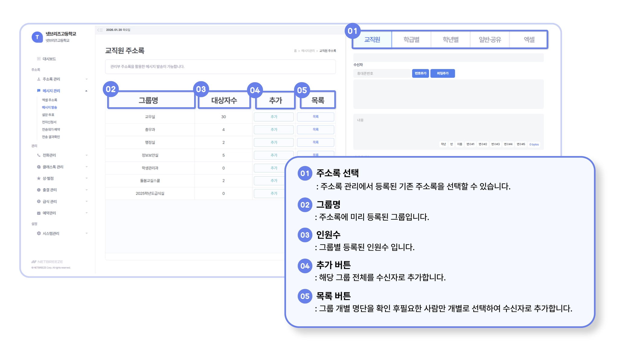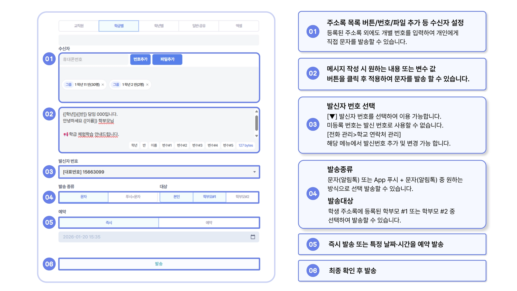 학교 교직원 ·학생 · 학부모 등 에게 필요한 문자 메시지를 발송할 수 있습니다.