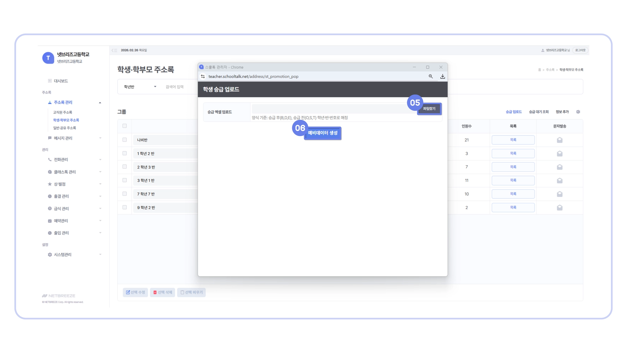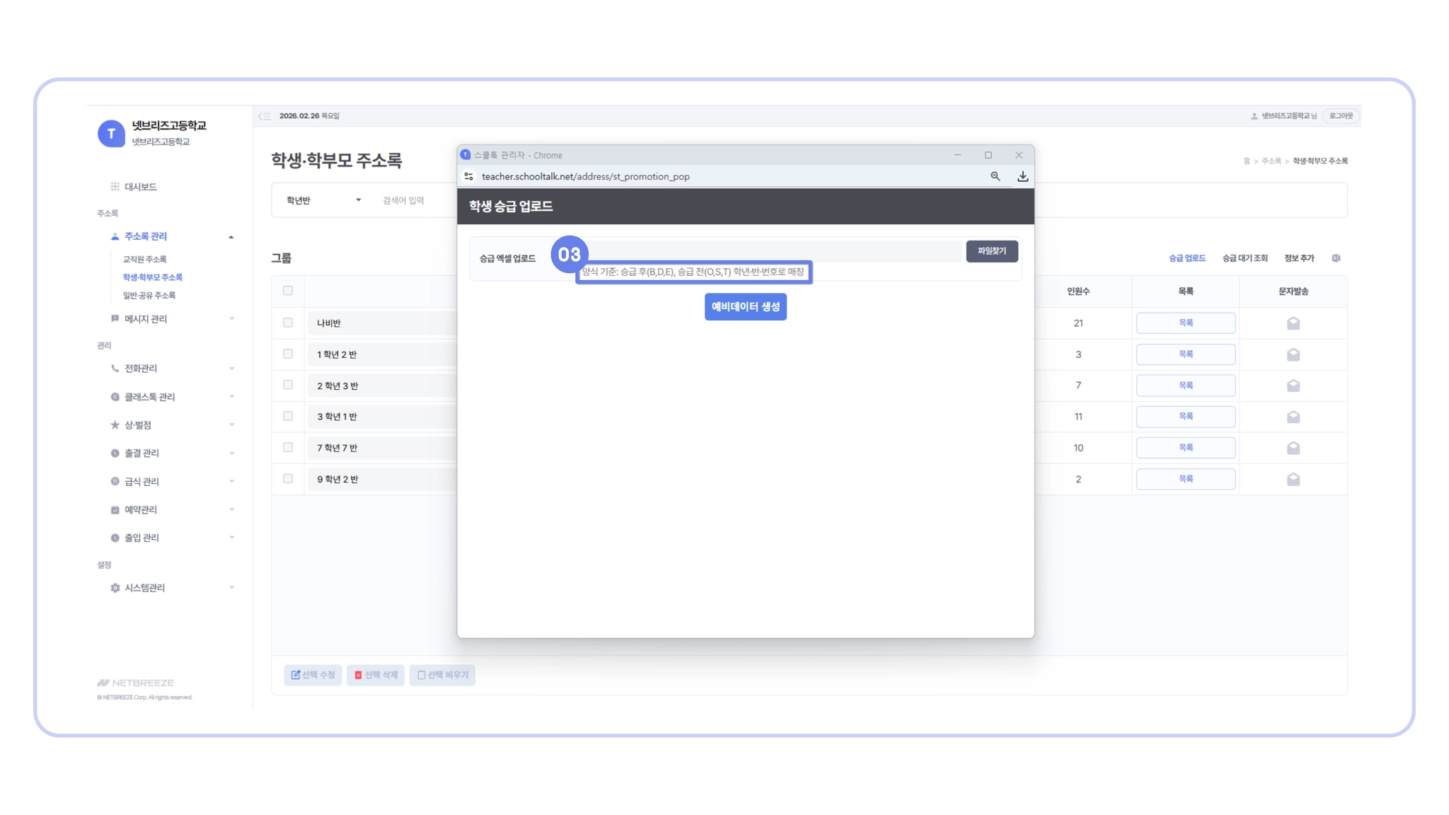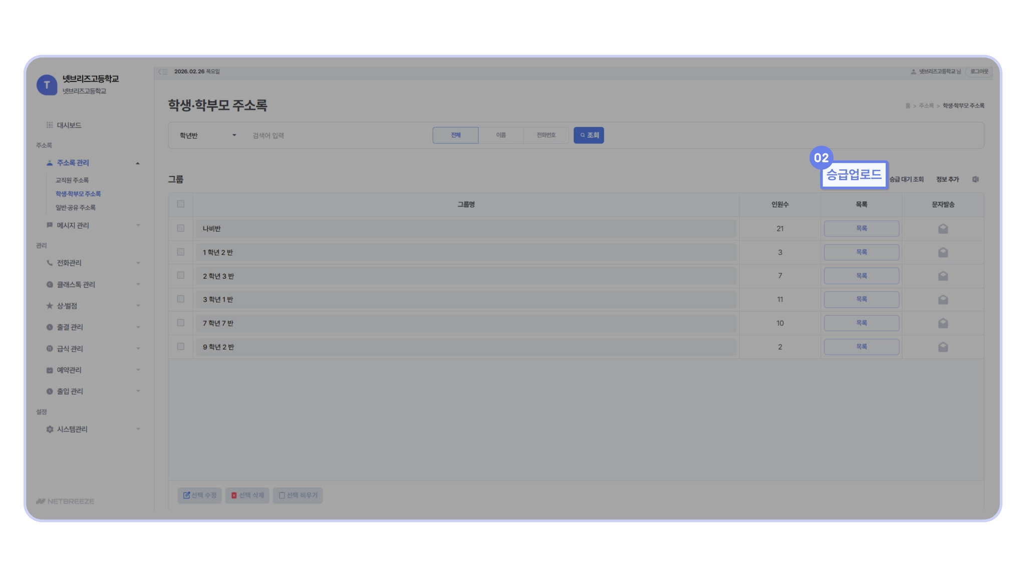 승급 작업을 시작하기 전, 만약의 상황을 대비해 기존 학생·학부모 주소록을 미리 다운로드(백업) 해 두시면 더욱 안심하고 작업하실 수 있어요.