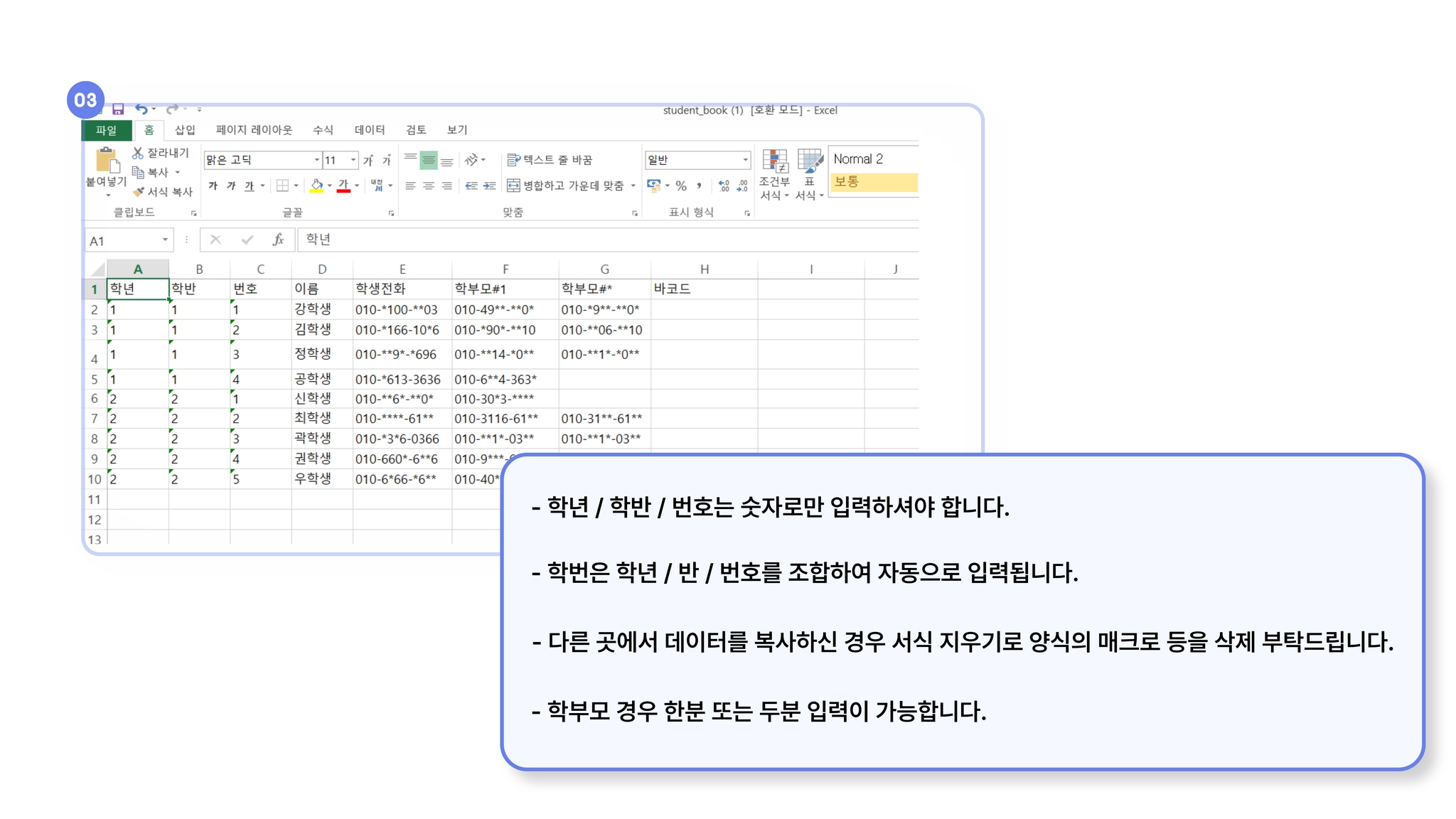 학생 · 학부모 주소록에 개별 연락처를 액셀 파일로 등록하는 방법 입니다.
