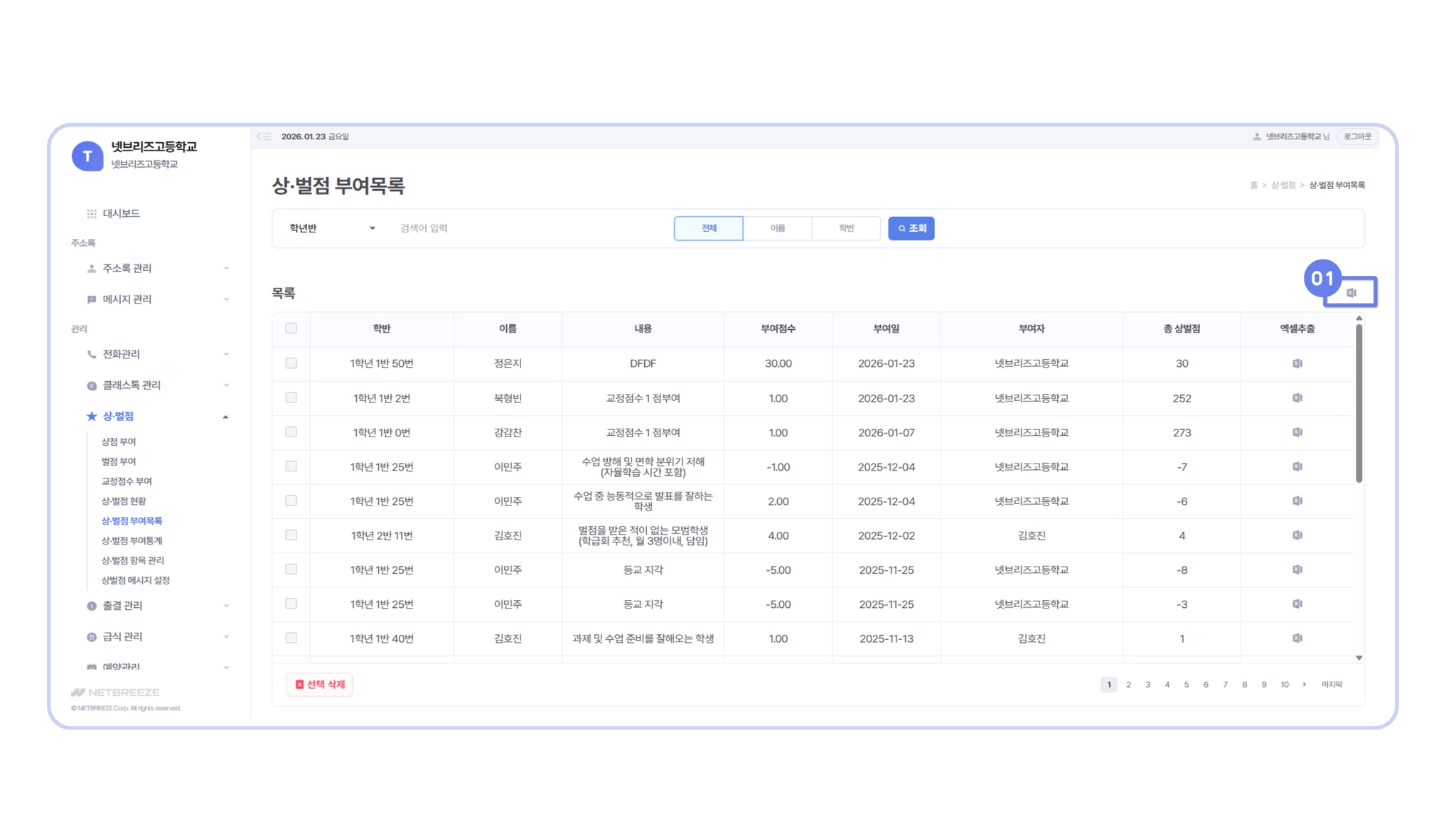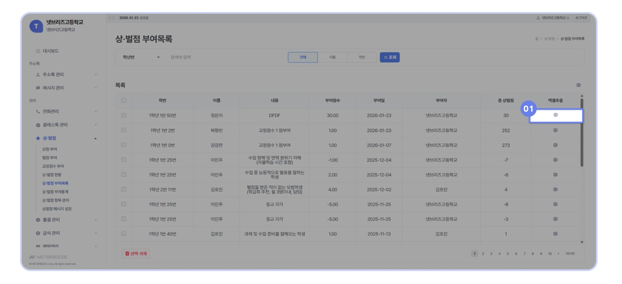 학생의 상 · 벌점 부여 목록을 액셀 파일로 내려받기 기능을 제공합니다.