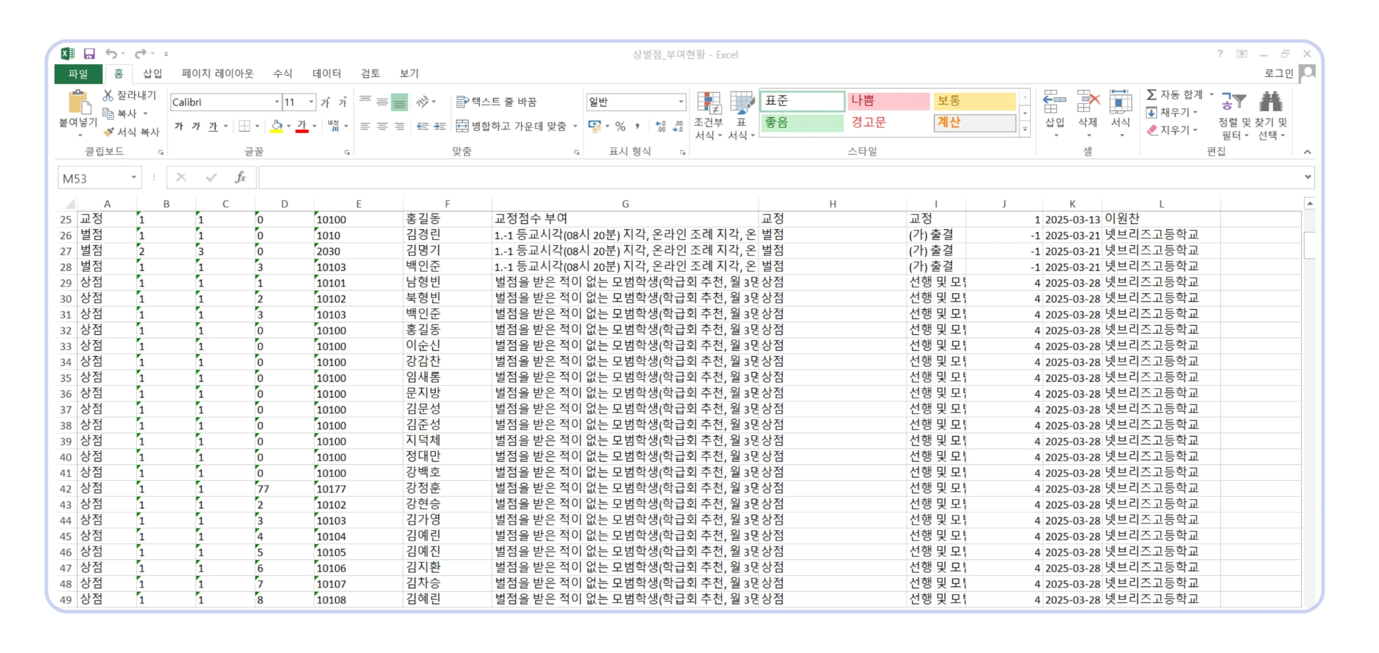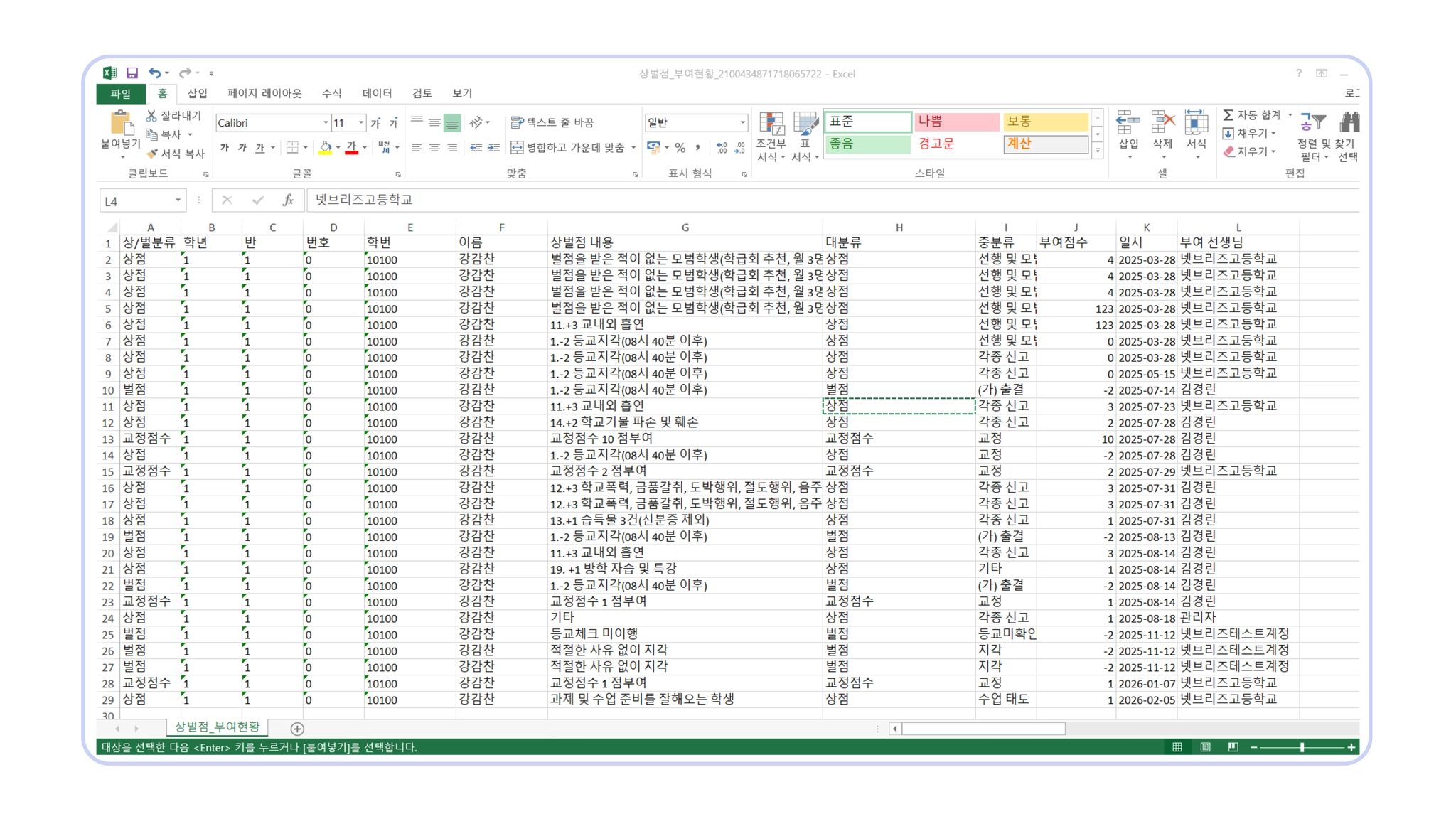 해당 학생의 날짜별 상벌점 항목, 점수 등 엑셀 파일이 생성됩니다.