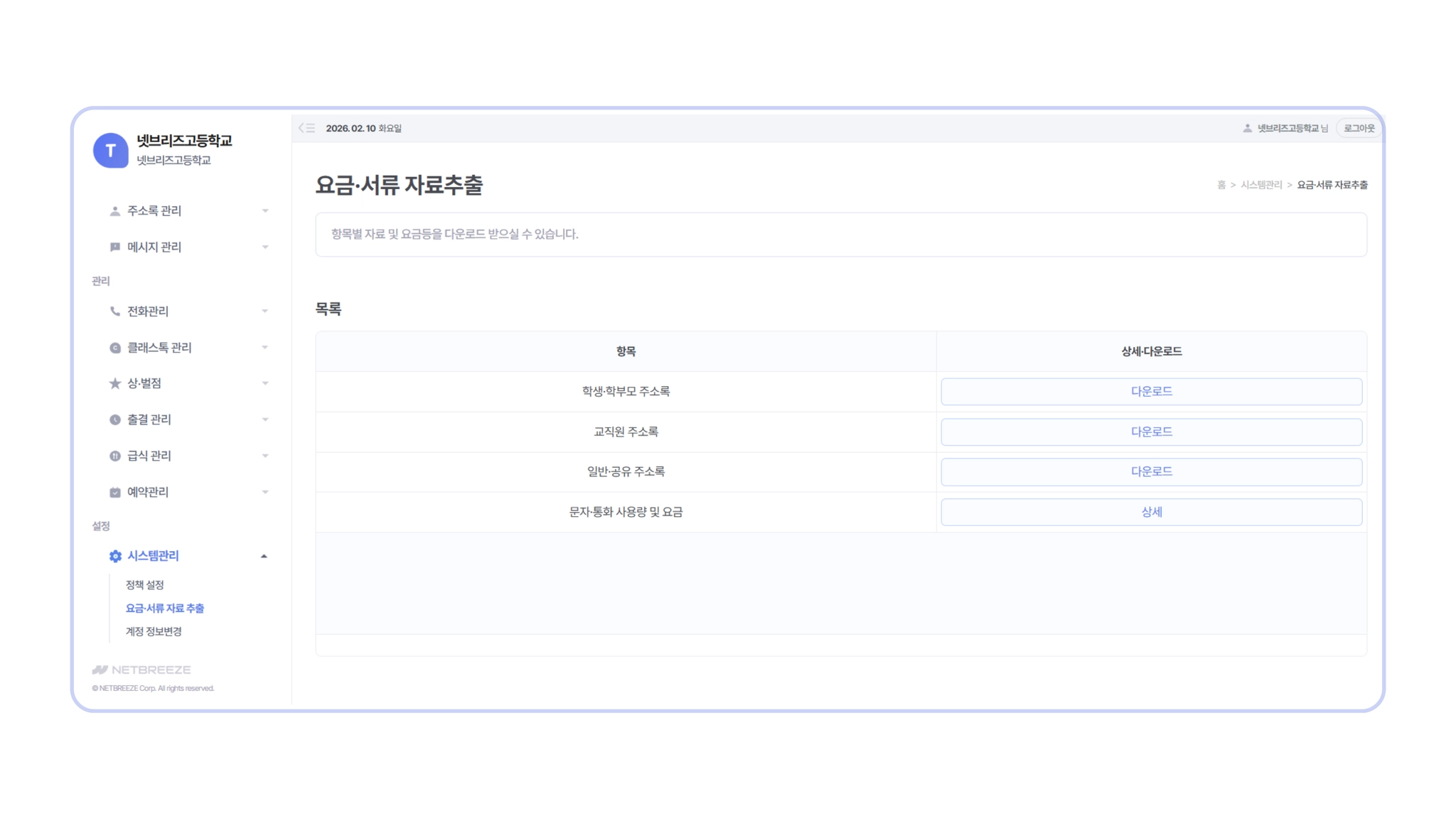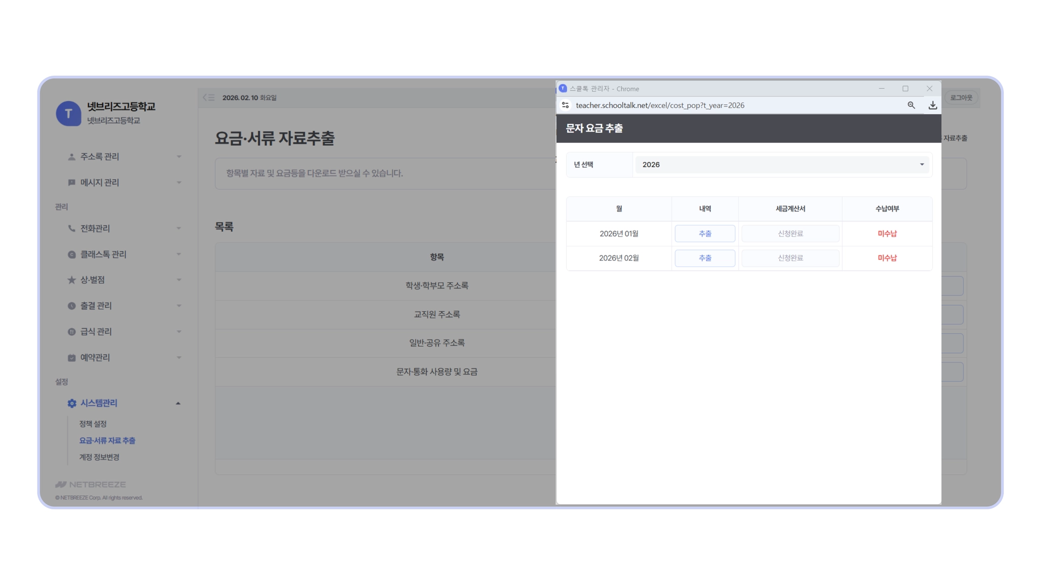 시스템관리 > 요금 · 서류 자료 추출]